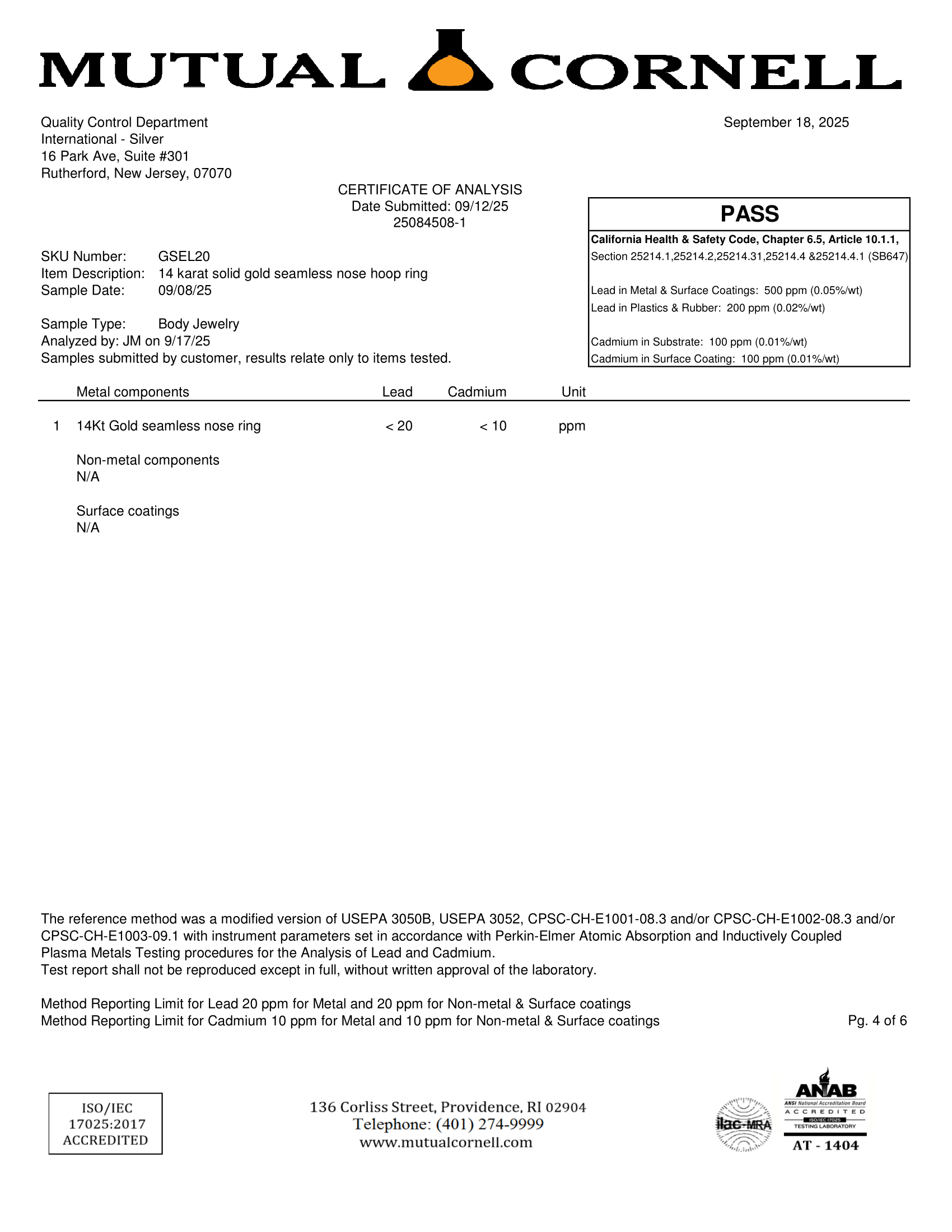 Certification of 14Kt Gold and Sterling Silver of International-Silver Body Jewelry