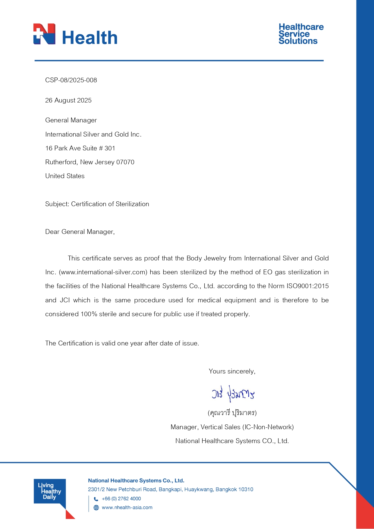 Certification of Titanium G23 of International-Silver Body Jewelry
